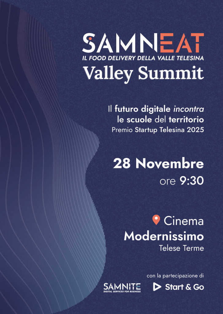 Venerdì 28 novembre apre il Samneat Valley Summit, rivolto a studenti e scuole: una mattinata di ispirazione e confronto con storie di innovazione, la presentazione del percorso che ha portato alla nascita di Samneat – da idea a piattaforma reale – e l’anteprima della nuova App Rider. Momento clou, la consegna del Premio StartUp Telesina 2025 e il lancio della seconda edizione del contest, con i saluti delle istituzioni.