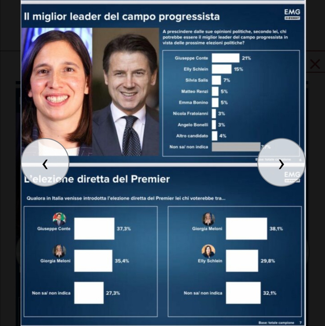 Se leggo bene il significato del sondaggio tra eventuali PDC, battiamo Meloni se schieriamo Conte 🤗, mentre con Schlein vincerebbe la Ducia… 😬