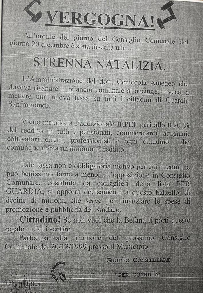 le accuse che sono state rivolte alla mia persona dal gruppo consiliare “Per Guardia” mi obbligano a fare qualche precisazione e, senza tirarla troppo per le lunghe, dico subito che contrariamente a quello che si vuol far credere con questo volantino dal titolo “Vergogna” diffuso nel paese, la decisione di introdurre l’addizionale IRPEF è stata una scelta “obbligata”, obbligata per far fronte alla riduzione dei trasferimenti statali di ben 275 milioni di lire operata dal Governo D’Alema e non potendo più mettere in bilancio i 364 milioni di lire (quale accertamento ICI per gli anni 1993-1996) che era stato messo in bilancio (e speso nei primi 6 mesi dell’anno 1999) da coloro che erano alla guida della nostra comunità e che oggi fanno finta di scandalizzarsi per la decisione assunta ed invitano il popolo guardiese alla rivolta. Soldi spesi prima di incassarli e senza aver previsto le voci specifiche per mettere l’Ufficio Finanziario in condizione di poter recuperare tali somme.