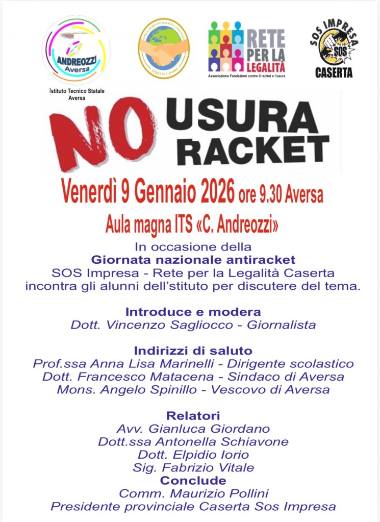 Venerdì 9 gennaio, alle ore 9.30, nell’aula magna dell’Istituto Tecnico “Andreozzi”, Sos Impresa – Rete per la Legalità Caserta incontrerà gli studenti in un momento di confronto e riflessione dedicato alla prevenzione e al contrasto dei fenomeni estorsivi, in occasione della Giornata Nazionale Antiracket.