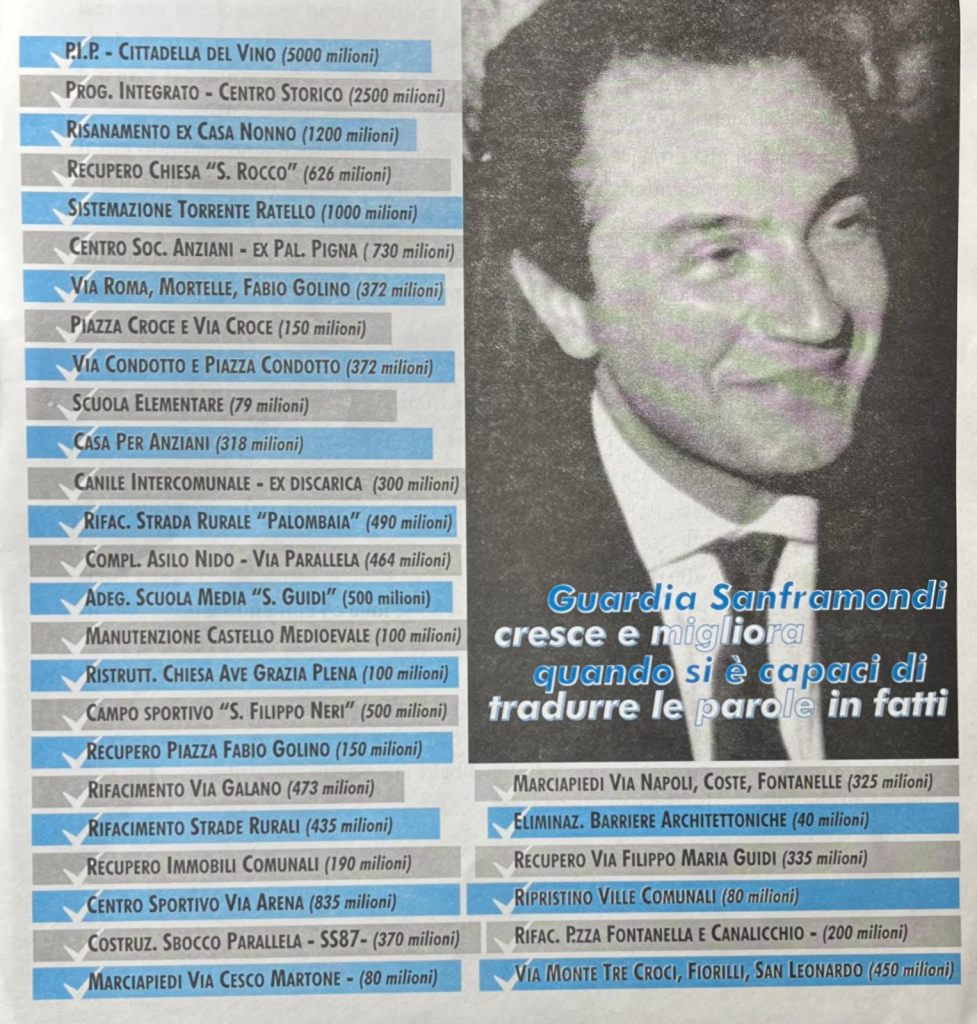 Infine, non posso non ricordare la straordinaria azione politico-amministrativa svolta per assicurare a Guardia Sanframondi il finanziamento per il recupero del Centro Storico ( 2miliardi500milioni di lire ) e le iniziative intraprese negli ultimi mesi del 2001 in tema di reperimento delle necessarie risorse finanziarie per giungere alla sottoscrizione della convenzione per la predisposizione del Programma Integrato Definitivo di Riqualificazione Urbana che può rappresentare uno strumento straordinario capace di generare rilevanti flussi finanziari (P.S. A tal proposito, non possiamo non ricordare il finanziamento di 536mila105 euro ottenuto per il rifacimento della facciate di immobili ricadenti nel perimetro del Piano Integrato e che ha permesso a 41 famiglie guardiesi di realizzare importanti interventi di ristrutturazione).
