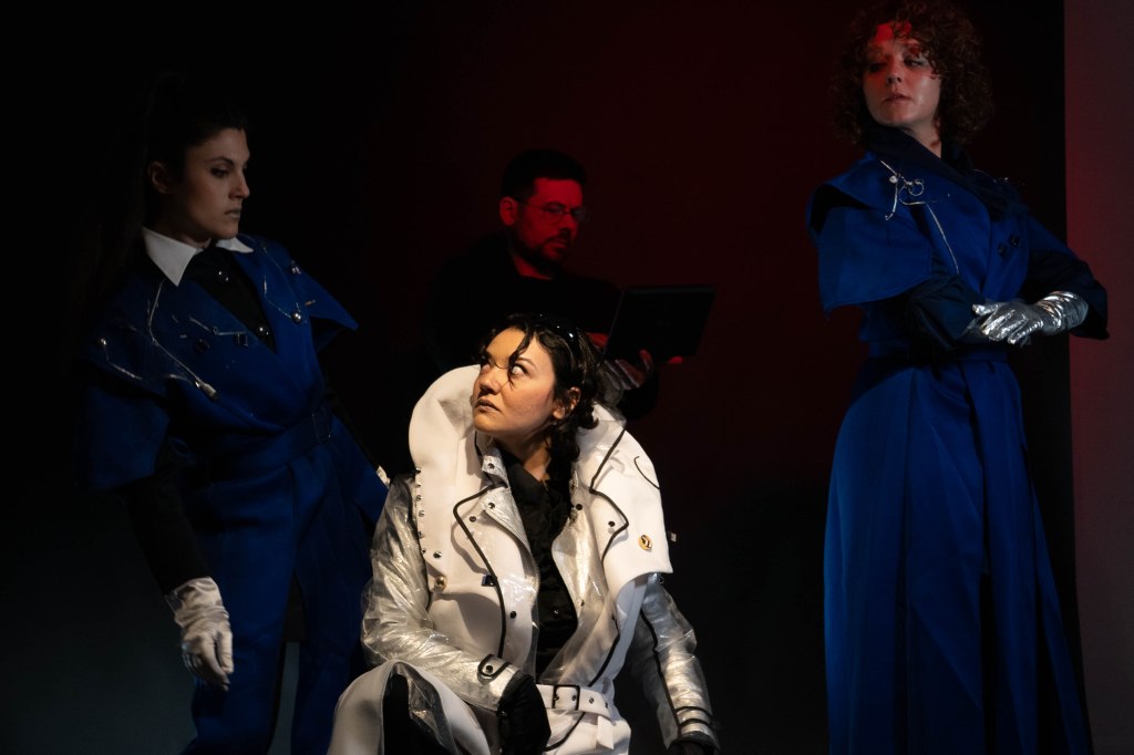 La scenografia minimalista evoca una zona di interferenza, spazio astratto di transizione, a metà tra il cuore di un server e una navicella spaziale, dove le azioni riflettono con amara ironia il collasso di senso e la lotta per l’efficienza. I costumi, uniformi di un futuro prossimo, così come gli elementi scenici creano un contrasto netto tra minimalismo quotidiano e monumentalità futuristica. Un’estetica high-tech che trasforma il corpo in interfaccia: non semplici personaggi, ma dispositivi viventi, identità algoritmiche, entità ibride tra umano e macchina.