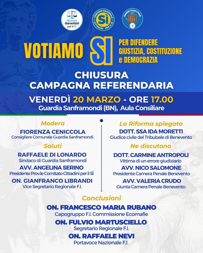 All’incontro interverranno a sostegno delle ragioni del SÌ, il dott. Carmine Antropoli, già sindaco di Capua, vittima di un errore giudiziario; gli avvocati Nico Salomone, Presidente Camera Penale di Benevento e Valeria Crudo, membro della Giunta della Camera Penale di Benevento. Le conclusioni affidate alle massime rappresentanze provinciali, regionali e nazionali di Forza Italia: gli onorevoli Francesco Maria Rubano, Fulvio Martusciello e Raffaele Nevi.