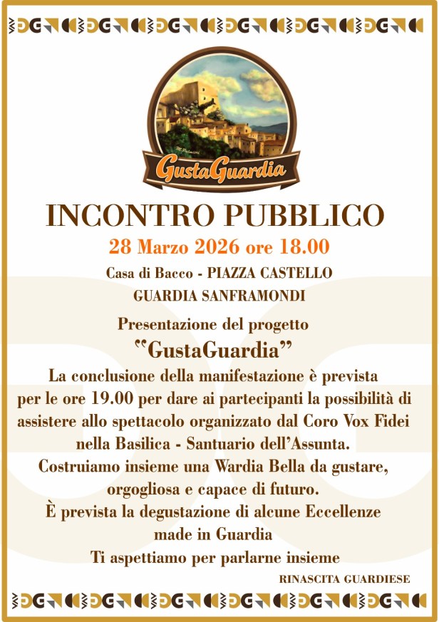C’è un momento in cui le idee smettono di essere parole e iniziano a diventare fatti. E’ esattamente ciò che sta accadendo a Guardia Sanframondi con il progetto “GustaGuardia” che sarà presentato ufficialmente sabato 28 marzo alle ore 18 nella “Casa di Bacco” in piazza Castello. E’un primo passo concreto dentro un percorso più ampio, strutturato, ambizioso e nasce con un’idea semplice e potente: valorizzare l’identità guardiese attraverso il gusto, la cultura, la memoria.